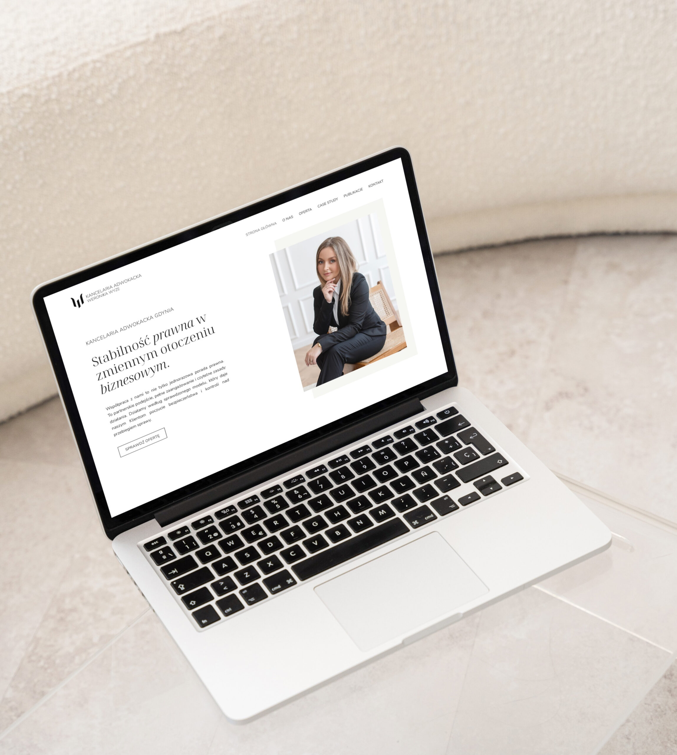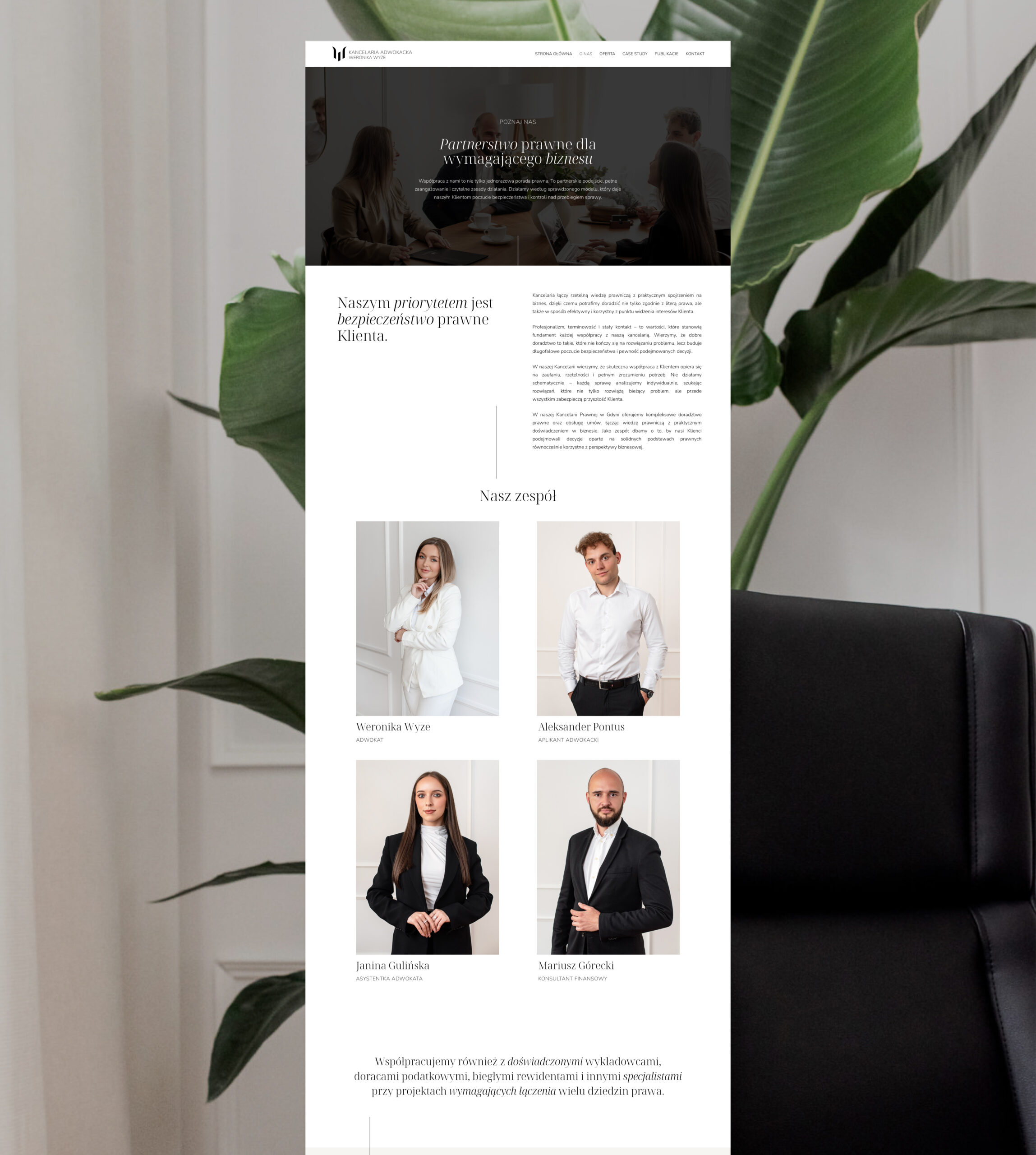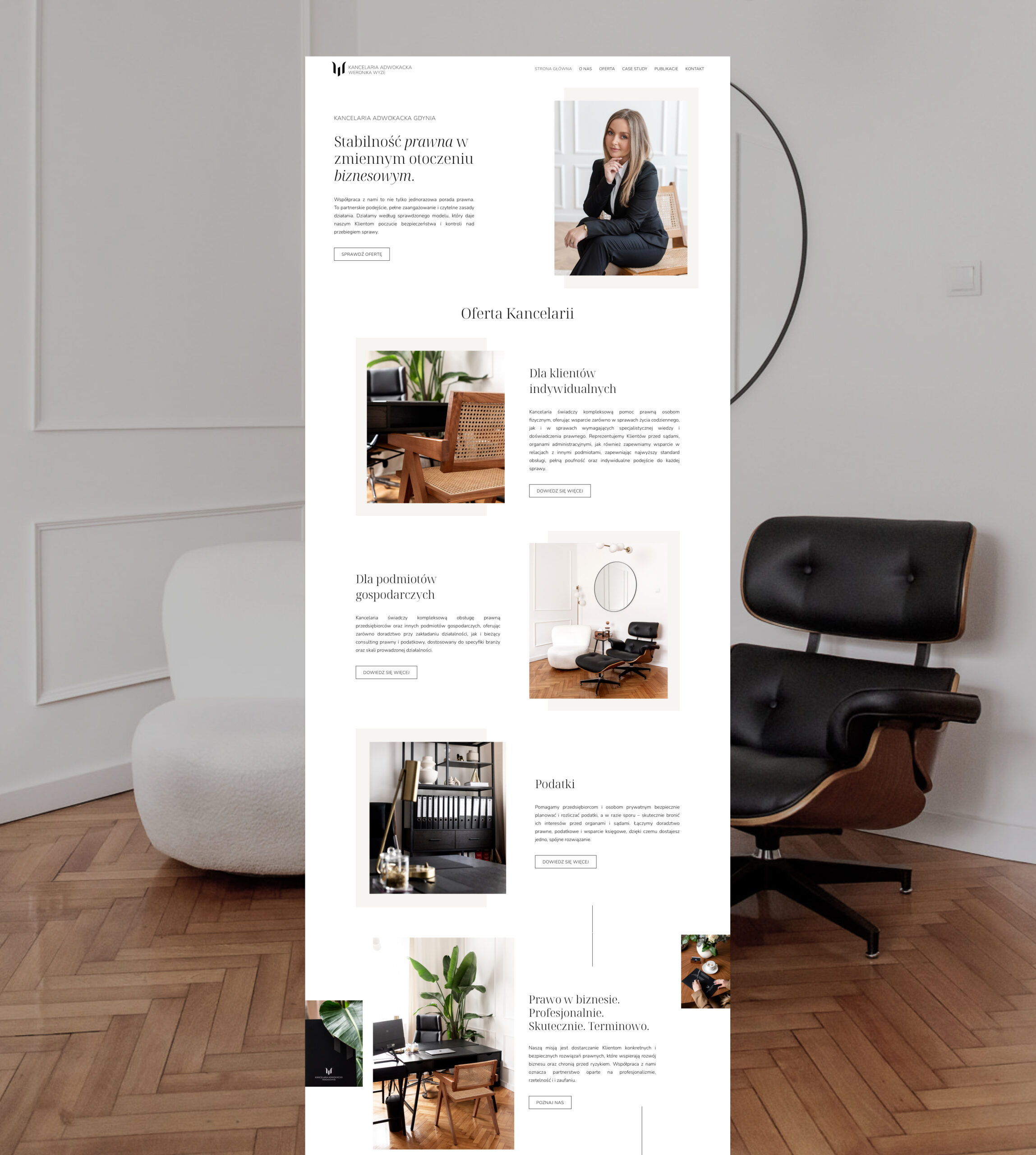 Projekt powstał z myślą o estetyce, która podkreśla profesjonalizm i wiarygodność kancelarii, jednocześnie pozostaje lekka i ponadczasowa. Zależało nam na przejrzystym układzie i formie, która pozwala łatwo zapoznać się z ofertą oraz doświadczeniem zespołu.